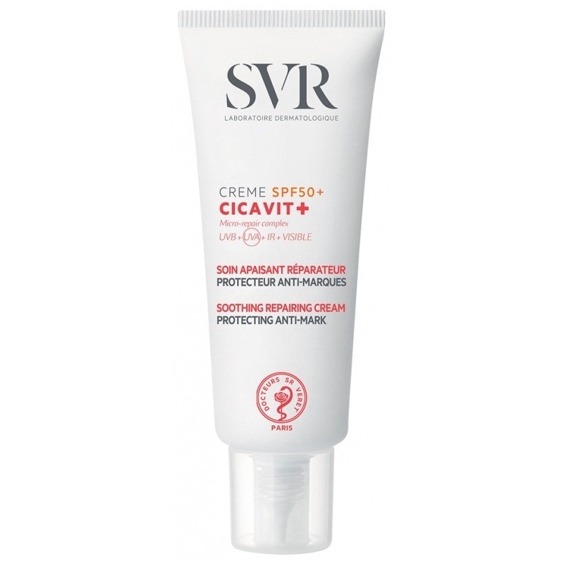SVR Cicavit+ Crema SPF50+ es un tratamiento reparador y protector especialmente formulado para pieles dañadas que requieren una alta protección solar. Ofrece una defensa completa contra los rayos UVA, UVB, infrarrojos y la luz visible, lo que lo convierte en el aliado perfecto para evitar manchas rojas o marrones en cicatrices o rasguños. Su fórmula alivia y acelera la reparación de la piel hasta 7 veces más rápido, ayudando a prevenir la aparición de marcas.