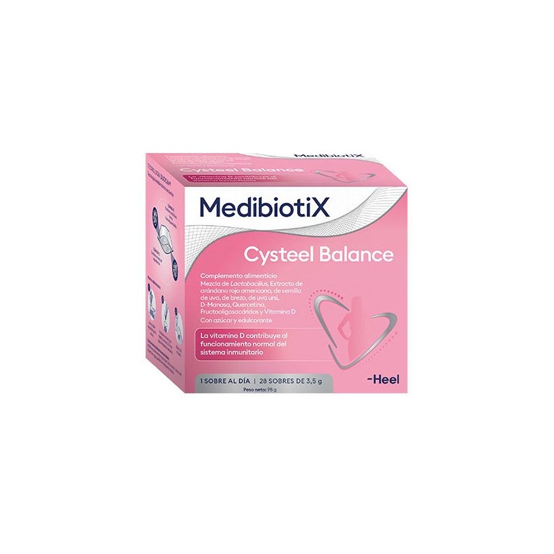 CYSTEEL BALANCE, COMPLEMENTO ALIMENTICIO QUE CONTRIBUYE AL EQUILIBRIO DE LA MICROBIOTA INTESTINAL Y VAGINAL, ES EL NUEVO SIMBIÓTICO DE LA LÍNEA MEDIBIOTIX DE LABORATORIOS HEEL ESPAÑA. CYSTEEL BALANCE ES EL SIMBIÓTICO IDEAL COMO COADYUVANTE AL TRATAMIENTO ANTIBIÓTICO Y PARA EL MANTENIMIENTO DE LA SALUD VAGINAL Y DE LAS VÍAS URINARIAS.CYSTEEL BALANCE SE PRESENTA EN ENVASE CON 28 SOBRES CON TECNOLOGÍA DUOCAM®, DE DOBLE CÁMARA, QUE ASEGURA LA CALIDAD DEL PRODUCTO Y SU VIABILIDAD. INDICADO EN ADULTOS Y ADOLESCENTES MAYORES DE 12 AÑOS*. SE RECOMIENDA TOMAR UN SOBRE AL DÍA DISUELTO EN AGUA, PREFERIBLEMENTE POR LAS MAÑANAS. SIN GLUTEN Y SIN LACTOSA.COMPOSICIÓNPROBIÓTICOS:LACTOBACILLUS ACIDOPHILUS LA-14LACTOBACILLUS RHAMNOSUS HN001 (SD5675)PREBIÓTICOS: 200 MG DE FRUCTOOLIGOSACÁRIDOS.PROANTOCIANIDINAS: EXTRACTO SECO DE ARÁNDANO ROJO AMERICANO Y EXTRACTO SECO DE SEMILLA DE UVA.800 MG DE D-MANOSA.50 MG DE BREZO. EL BREZO TIENE PROPIEDADES DIURÉTICAS, BACTERICIDAS Y ANTIINFLAMATORIAS.25 MG DE UVA URSI. CON PROPIEDADES ANTIINFLAMATORIAS Y DIURÉTICAS.42,5 MG DE QUERCETINA. CON PROPIEDADES ANTIOXIDANTES Y ANTIINFLAMATORIAS.VITAMINA D. CONTRIBUYE AL BUEN FUNCIONAMIENTO DEL SISTEMA INMUNE.GRACIAS A LA MEZCLA DE SUS COMPONENTES, CYSTEEL BALANCE CONTRIBUYE AL EQUILIBRIO DE LA MICROBIOTA INTESTINAL Y VAGINAL Y, ADEMÁS, ES ÚTIL:COMO COADYUVANTE AL TRATAMIENTO ANTIBIÓTICO O ANTIFÚNGICO EN INFECCIONES GENITO-URINARIAS.PARA EL MANTENIMIENTO DE LA SALUD VAGINAL Y DE LAS VÍAS URINARIAS YA QUE CONTRIBUYE AL EQUILIBRIO DE LA MICROBIOTA VAGINAL RESIDENTE.