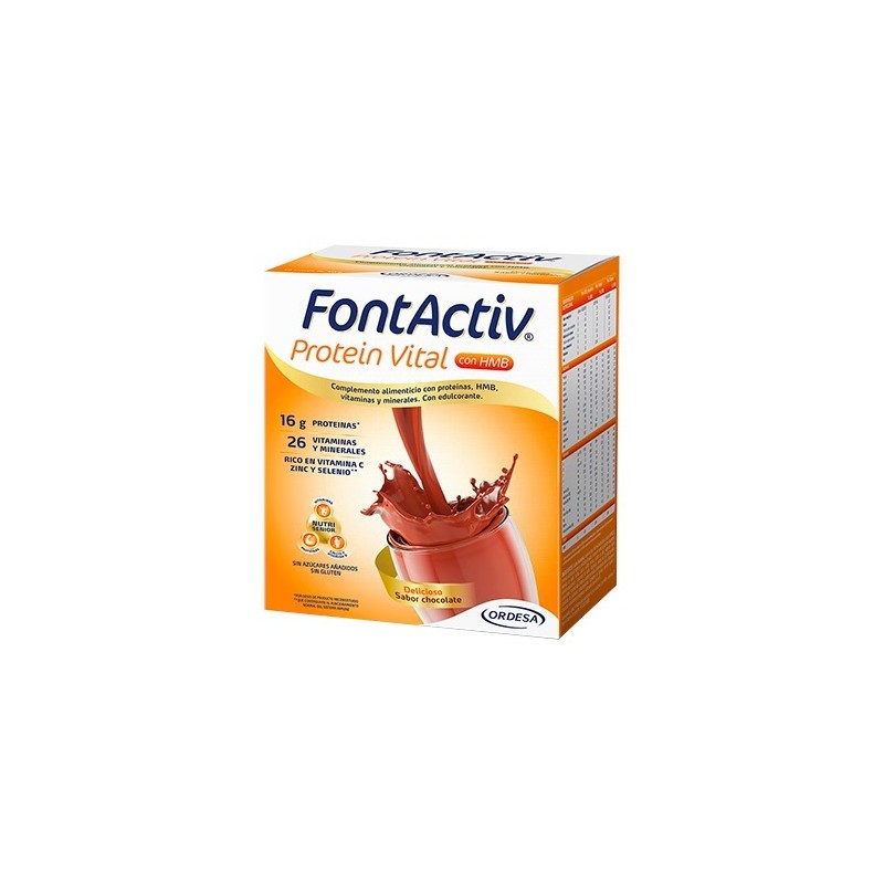 CON EL AVANCE DE LA EDAD, SE PRODUCE UNA PÉRDIDA GRADUAL DE MASA MUSCULAR, FUERZA, Y FUNCIONALIDAD. LA MASA MUSCULAR ESTÁ DIRECTAMENTE RELACIONADA CON LA MOVILIDAD Y EL EQUILIBRIO EN LA PERSONA, POR LO UNA PÉRDIDA ACELERADA DE LA MISMA AUMENTA EL RIESGO DE CAÍDAS Y FRACTURAS EN EL ADULTO MAYOR. ESTE PROCESO PUEDE VERSE ACELERADO EN LAS PERSONAS MAYORES CON INACTIVIDAD, COMO POR EJEMPLO EL REPOSO EN CAMA POR ALGUNA CONVALECENCIA.JUNTO CON LA INACTIVIDAD, UNA ALIMENTACIÓN INADECUADA Y LA PÉRDIDA DEL APETITO SON TRES ASPECTOS QUE ACELERAN LA PÉRDIDA DE MASA MUSCULAR. EL CONSUMO DE PROTEÍNAS DISMINUYE EN LOS ADULTOS MAYORES DEBIDO A MÚLTIPLES SITUACIONES FISIOLÓGICAS (INAPETENCIA, PROBLEMAS DE MASTICACIÓN…), LO QUE COMPORTA NO LLEGAR A CUBRIR LAS NECESIDADES DIARIAS DE ESTE NUTRIENTE.SITUACIONES COMO LA PÉRDIDA DE MASA MUSCULAR Y DEBILIDAD MUSCULAR, CONVALECENCIA, PÉRDIDA DE PESO INVOLUNTARIA O LA BAJA INGESTA DE ALIMENTOS PROTEICOS A TRAVÉS DE LA ALIMENTACIÓN TRADICIONAL REQUIEREN DE UN APORTE NUTRICIONAL EXTRA DE PROTEÍNAS, DONDE LOS COMPLEMENTOS ALIMENTICIOS PUEDEN RESULTAR DE UTILIDAD. UN APORTE SUFICIENTE DE PROTEÍNAS NUTRICIONALES AYUDA A FRENAR LA PÉRDIDA DE MASA MUSCULAR ASOCIADO A LA EDAD.ASÍ PUES, SE RECOMIENDA LA REALIZACIÓN DE EJERCICIO DE MANERA REGULAR Y UNA ALIMENTACIÓN SALUDABLE CON UN BUEN APORTE DE PROTEÍNAS, PARA AYUDAR A MANTENER EL ESTADO DE LOS MÚSCULOS YA QUE CUMPLEN UNA FUNCIÓN ESENCIAL EN EL ENVEJECIMIENTO SALUDABLE.¿QUÉ LE APORTA FONTACTIV FORTE AL PACIENTE SÉNIOR?FONTACTIV PROTEIN VITAL ES UN COMPLEMENTO ALIMENTICIO CON PROTEÍNAS, HIDROXIMETILBUTIRATO (HMB), 13 VITAMINAS Y 13 MINERALES.FONTACTIV FORTE SE CARACTERIZA POR:FÓRMULA HIPERPROTEICA (ALTO EN PROTEÍNA): 16G DE PROTEÍNA POR DOSIS (30G EN 200ML LECHE SEMIDESNATADA)CON HMB (HIDROXIMETILBUTIRATO): METABOLITO DEL AMINOÁCIDO ESENCIAL LEUCINA. LA FÓRMULA EXCLUSIVA QUE COMBINA PROTEÍNAS, HIDROXIMETILBUTIRATO DE CALCIO (HMB) Y VITAMINA D, CONTRIBUYEN AL MANTENIMIENTO DE LOS MÚSCULOS Y HUESOS.*RICO EN ZINC, SELENIO Y VITAMINA C, QUE CONTRIBUYEN EN EL FUNCIONAMIENTO NORMAL DEL SISTEMA INMUNITARIO.APORTA LA ENERGÍA NECESARIA PARA LLEVAR A CABO LAS ACTIVIDADES DIARIAS: FÓRMULA NORMOCALÓRICA. 1 TOMA APORTA DESDE 197KCAL (30G EN 200ML LECHE SEMIDESNATADA) O 395KCAL (60G EN 200ML LECHE SEMIDESNATADA).0% AZÚCARES AÑADIDOS: AZÚCARES NATURALMENTE PRESENTES PROCEDENTES DE LA LECHE DESNATADA DEL PRODUCTO.SIN ACEITE DE PALMA: LÍPIDOS PROCEDENTES DE LA LECHE DESNATADA DEL PRODUCTO.AGRADABLE SABOR Y TEXTURA.ADEMÁS, APORTA LA FÓRMULA NUTRISENIOR, UNA COMBINACIÓN DE NUTRIENTES ESPECIALMENTE PENSADOS PARA SATISFACER LAS NECESIDADES ENERGÉTICAS Y NUTRICIONALES DE ADULTOS Y MAYORES QUE TIENEN ALGUNA DIFICULTAD PARA ALIMENTARSE CON NORMALIDAD O QUE SE ENCUENTRAN EN ALGUNA SITUACIÓN ESPECÍFICA DONDE LOS REQUERIMIENTOS NUTRICIONALES ESTÁN AUMENTADOS:ENERGÍA: CON VITAMINAS C, B2, B6 Y B12 QUE AYUDAN A REDUCIR EL CANSANCIO Y LA FATIGA.MÚSCULO: LAS PROTEÍNAS CONTRIBUYEN A CONSERVAR LA MASA MUSCULAR. HUESOS: EL CALCIO Y LA VITAMINA D CONTRIBUYEN AL MANTENIMIENTO DE UNOS HUESOS NORMALES.INGREDIENTESLECHE DESNATADA, CACO EN POLVO, HIDROXIMETILBUTIRATO CÁLCICO (HMBCA), MINERALES (CITRATO DE MAGNESIO, MOLIBDATO DE SODIO, CLORURO DE CROMO, SULFATO DE MANGANESO, CLORURO DE CROMO, SELENIATO DE SODIO, SULFATO CÚPRICO, SULFATO FERROSO, SULFATO DE ZINC), VITAMINAS (ÁCIDO PTEROILMONOGLUTÁMICO, L-ASCORBATO DE SODIO, RIBOFLAVINA, ACETATO DE DL-ALFA-TOCOFERILO, COLECALCIFEROL, NICOTINAMIDA, D-BIOTINA, ACETATO DE RETINILIO, D-PANTOTENATO CÁLCICO, FILOQUINONA, CLORHIDRATO DE PIRIDOXINA, CIANOCOBALAMINA, CLORHIDRATO DE TIAMINA), AROMA (VAINILLA Y CHOCOLATE), ESTABILIZANTE (CARRAGENANO), EDULCORANTE (ACESULFAMO K).DOSIFICACIONESPREPARACIÓN CON LECHE:PARA PREPARAR UNA DOSIS, AÑADIR EN UN VASO GRANDE, EL CONTENIDO DE UN SOBRE (30G) EN 200ML DE LECHE SEMIDESNATADA FRÍA O CALIENTE. SE PUEDE PREPARAR TAMBIÉN EN AGUA O BEBIDAS VEGETALES, SIGUIENDO LA MISMA DOSIFICACIÓN. REMOVER HASTA SU TOTAL DISOLUCIÓN.DOSIS DIARIA: PARA COMPLEMENTAR LA ALIMENTACIÓN DIARIA SE RECOMIENDA TOMAR 1-2 DOSIS DIARIAS.CONSERVACIÓNGUARDAR EN LUGAR FRESCO Y SECO.UNA VEZ PREPARADO, CONSUMIR INMEDIATAMENTE.RECUERDALOS COMPLEMENTOS ALIMENTICIOS NO DEBEN SUSTITUIR UNA DIETA VARIADA Y EQUILIBRADA Y UN ESTILO DE VIDA SALUDABLE.MANTENER FUERA DEL ALCANCE DE LOS NIÑOS MÁS PEQUEÑOS.NO SUPERAR LA DOSIS DIARIA RECOMENDADA.